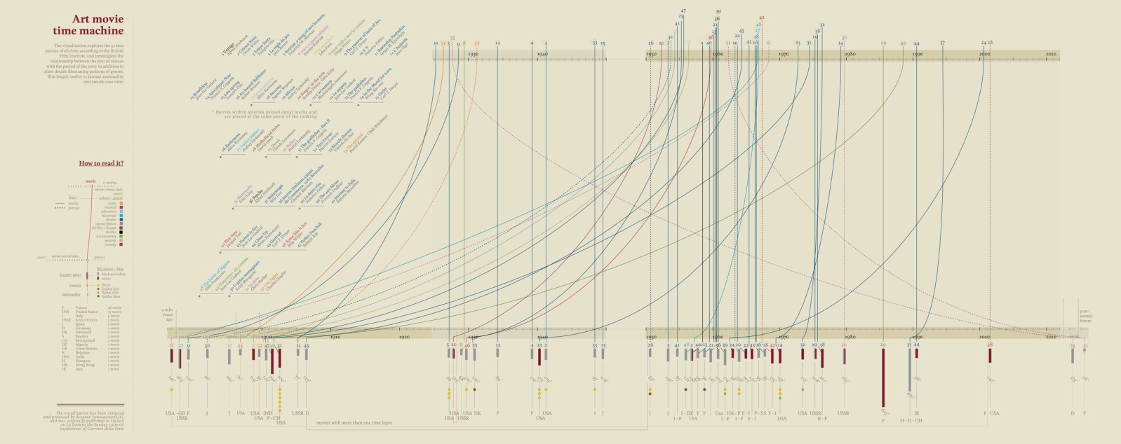 Giorgia Lupii《Corriere della Sera》创作的可视化设计中,多次采用多个时间轴出现在同一静态图像的方法,在《Art Movie Time Machine》(见图1)中尤为突出,此案例根据英国电影学会评选的52部优秀电影进行信息可视化,展示了上映年份与故事发生时间之间的关系,并将类型、影片时长、现实与幻想、国别和奖项等信息一并进行呈现。