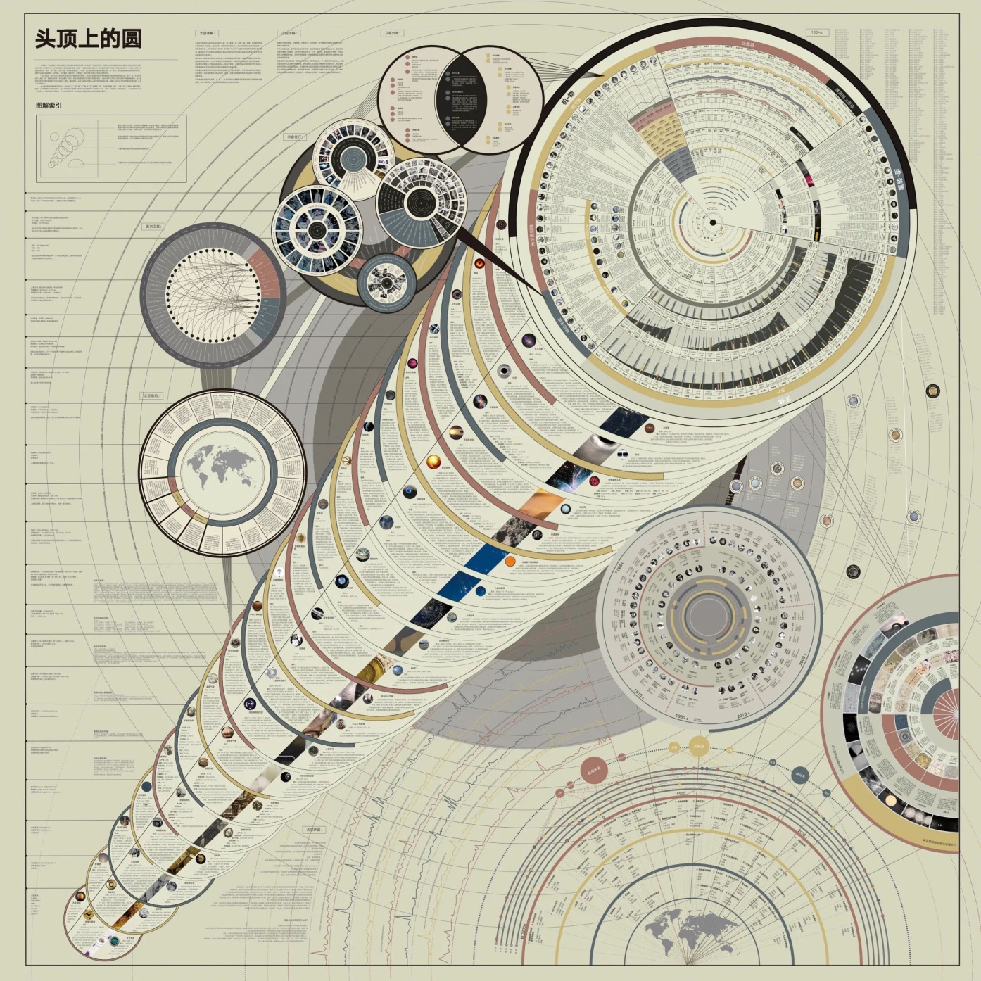 本案例《头顶上的圆》是白金创意国际大赛获奖作品(见图3),该作品以宇宙探索中的圆形为主题,梳理人类从古至今对宇宙的观测、想象与实践历程。整张图以“圆”作为最基本的视觉语言,通过中心倾斜串联的圆形结构建立骨架,将画面明确划分为上半部分的“实”(客观存在的以圆形存在的实体与用来探索宇宙的人造“圆”)与右下角的“虚”(与宇宙探索相关的艺术、科学与人文思想)两大板块。