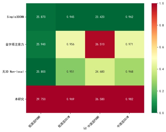 为了科学评价3D Non-local模块的性能提升,本研究将基于空间金字塔融合的复原方案作为基准对照组。实验分别在弱湍流与中等强度湍流环境下记录了模型的关键指标。