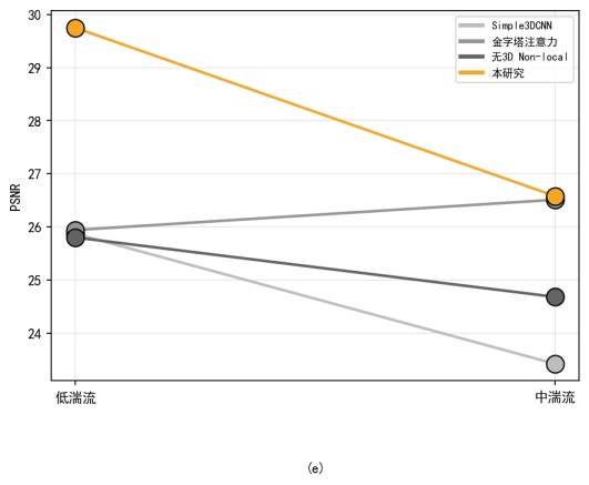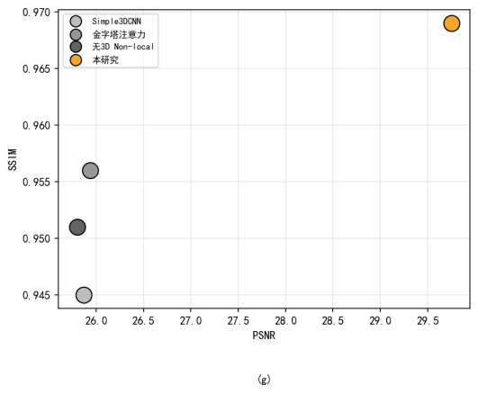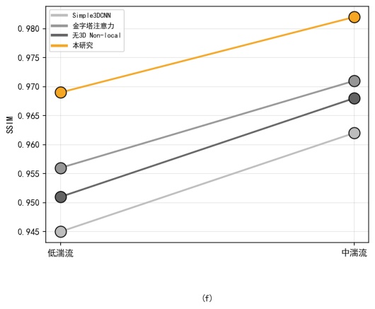 数据揭示了一个关键的技术特征,即SSIM对3D Non-local模块的响应远比PSNR更为敏感。Simple3DCNN虽然具备基本的时空建模能力,但在中湍流条件下SSIM仅为0.864,难以应对复杂的非刚性畸变;而引入3D Non-local机制后,模型通过构建全时空维度的亲和度矩阵,有效捕捉了跨帧的长程依赖关系,在矫正复杂几何扭曲方面展现出压倒性优势。相比之下,金字塔注意力方案虽在中湍流PSNR指标上接近本方法,但其SSIM明显低于本方法的0.935,印证了全局时空依赖建模对结构保持的关键作用。