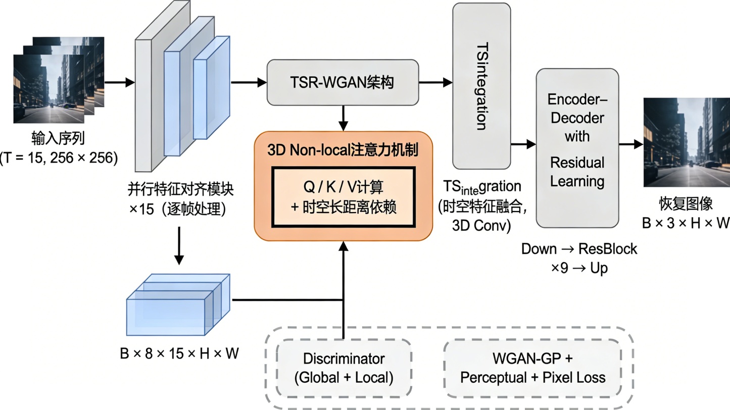 本研究提出的集成3D Non-local注意力机制的TSR-WGAN模型,在大气湍流退化图像序列复原任务中展现出了卓越的性能,特别是在恢复图像的时空结构连贯性方面。本节将结合实验结果,对模型的核心工作机制、创新点的理论贡献及其意义进行系统阐述。
