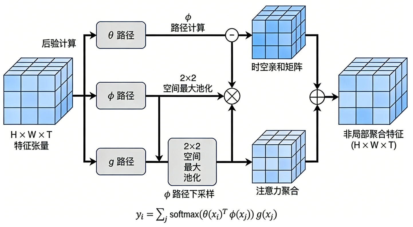 为线性变换函数。这一设计使得模型能够计算特征图中任意两个位置之间的相关性,从而捕捉长程时空依赖关系。注意力权重通过softmax函数归一化: