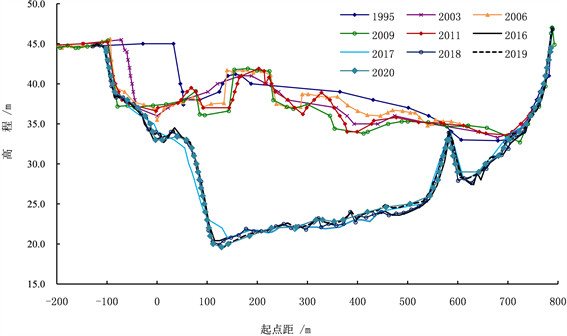 根据新江口水文站1965年以来实测大断面资料进行断面冲淤对比分析,1981年之前边滩部分有明显淤积,主槽冲淤不明显 [4] (见图3)。