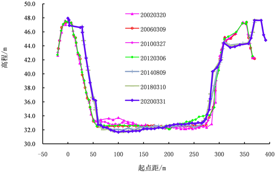 松滋河东西支汊口附近河段断面总体为“U”或不规则的“W”型,本河段两岸均建有堤防,局部河段有护岸工程,岸坡相对稳定,1995年以来表现为冲槽,年际间冲淤有所交替,局部河段岸坡有所崩退。松滋河东支口门附近2019、2020年受人类采砂活动影响,断面明显下切(典型松03和松102断面变化见图2)。