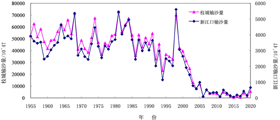 整体来说,三峡工程蓄水后,新江口站年输沙量明显减小,通过与枝城站输沙量变化进行对比分析,新江口站输沙量变化趋势与枝城站变化趋势一致,因此认为新江口站输沙量变化的主要影响因素为三峡工程以上上游来沙发生变化 [7]。