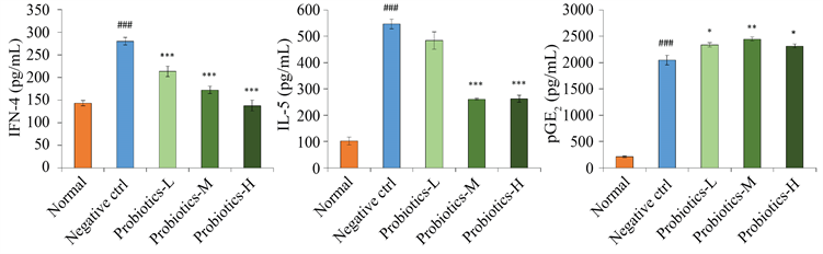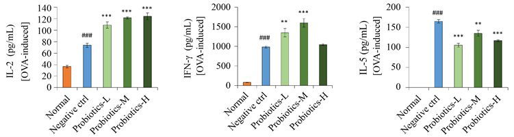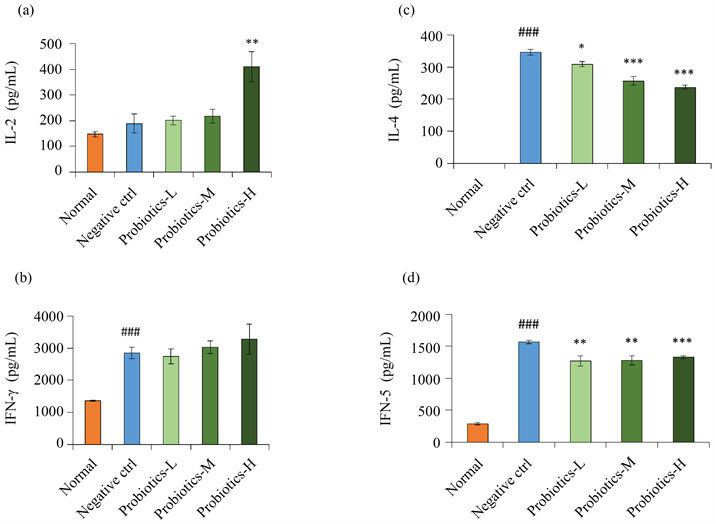 IL-2和IFN-γ为Th1细胞主要分泌的相关细胞激素。图4(a)的Con A诱导非特异性IL-2分泌,除了高剂量复合菌组外,其余组别与正常对照组相比皆不具有显著差异(p > 0.05)。说明负对照组、低、中剂量复合菌组对于Th1细胞分泌IL-2的调控并无显著影响。图4(b)的Con A诱导非特异性IFN-γ分泌,负对照组显著地高于正常组(p < 0.001),而不论低、中、高剂量组的复合益生菌皆与负对照组呈现不影响非特异性免疫调控的Th1细胞分泌IFN-γ (p > 0.05)。