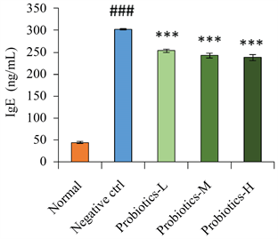 图5为血清中IgE抗体含量检测结果。负对照组的IgE含量显著高于正常对照组(p < 0.001),而复合型益生菌的组别,其IgE含量与负对照组相比,具有显著下降。说明在摄入复合型益生菌后,Th辅助细胞的细胞激素分泌受调控,亦使B细胞分泌较少的抗体IgE,进而减少IgE与过敏原的结合机会,降低过敏反应。