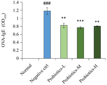 特异性免疫反应的免疫球蛋白OVA-IgE含量表示于图7。低、中、高剂量组的特异性免疫球蛋白IgE,皆较负对照组明显降低。说明复合型益生菌在特异性免疫反应上亦能降低IgE的产生,减少过敏反应的发生。