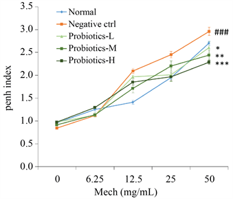 分别以 6.25、12.5、25、50 mg/mL浓度的Methacholine (Mech)刺激老鼠呼吸道,随着Mech刺激浓度的提高,老鼠的呼吸阻力越明显,结果显示于图8。在Mech 50 mg/mL下,负对照组肺部呼吸道阻力(Penh ratio)显著高于正常对照组(p < 0.001),而复合益生菌组的Penh ratio与负对照组相比,随着剂量的增加呈现显著减少的现象。说明本试验的复合型益生菌具有减缓过敏反应的呼吸阻力效果。