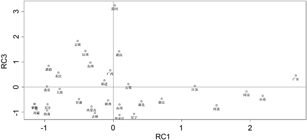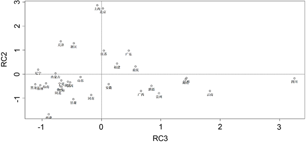 由表4结合变量的意义可知,在三个公因子中取因子载荷相对较大的变量。为了因子分析的效果,每个变量恰好只在一个公因子中出现一次。因此,我们认为:公共因子Factor1在人口数P、特殊教育学校数SC、教师数T、教育经费S中支出载荷较大,可以认为是教育条件与资源因子;公共因子Factor2在人均可支配收入M及城镇人口比重C中支出比重较大,认为公共因子Factor2是经济水平因子;公共因子Factor3在毕业生人数G、招生人数Z、在校生人数I上支出较大,可以认为是学生人数因子。