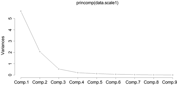 从表1中可以看到,各个变量间的相关系数取值有许多大于0.9,且大部分取值大于0.3。因此,原始数据间具有一定的相关性,适于使用因子分析法。除此之外,我们使用R软件中的KMO函数与bartlett.test函数,对数据进行KMO检验与Bartlett检验。我们得到KMO值为0.75,说明适合对数据进行因子分析;Bartlett检验的p值 < 2.2e−16,即p值 << 0.01,也说明此数据可以进行因子分析。