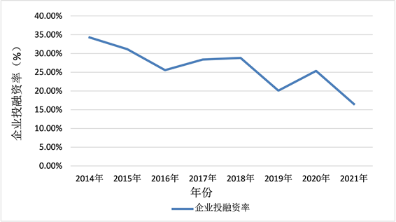 如图3所示,西部超导R&D投入强度、企业净利润率、间接税优惠和直接税优惠各指标总体呈现增长趋势,2019年受疫情影响,直接税优惠和间接税优惠有所降低,但企业净利润率呈现上升趋势,可以反映税收激励政策在西部超导技术发展过程中有明显激励作用。图4所示西部超导投融资率整体值逐年下降,因此税收激励政策在企业投融资方面作用不明显。