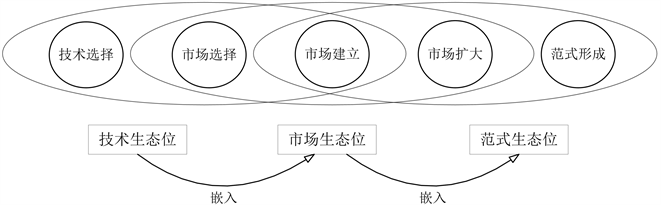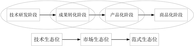 基于产业生命周期理论,并结合图1硬科技生态位演化与跃迁过程,本文将硬科技企业生态位跃迁发展过程分为:技术研发、成果转化、产品化和商品化四个重要阶段。其中技术生态位主要包括技术研发阶段至成果转化阶段,市场生态位主要包括成果转化阶段至产品化阶段,范式生态位阶段主要包括产品化阶段与商品化阶段,详见图2。