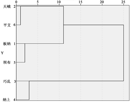 注:欧式距离为5时,地理位置更近的种群被聚为一类,且米槁种群之间的果实表型特征越相似。欧式距离值越小,聚类之间相似性越大,反之聚类之间相似性越小 Note: The Euclidean distance is 5, which means geographically closer populations was clustered into a group. And the more similar the fruit phenotypic characteristics between the C. migao. The smaller the Euclidean distance value, the greater the similarity between clusters. And conversely, the less similarity between clusters