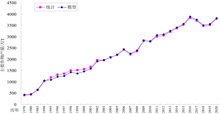 本文基于相关统计显著性检验方法,分别对“粮食总产”、“油料总产”、“棉花总产”、“主要作物产量”、“粮食产值”、“油料产值”、“棉花产值”和“农业总产值”8个产出目标进行了逐步回归,考虑到不同阶段作物单价对历史数据系列合理性影响,因此,综合筛选确定“主要作物产量”(粮、棉、油、甜菜、蔬菜、果瓜、苜蓿)作为产出目标。农业产出直接或间接投入因素较多,统计资料已有信息主要有:耕地面积(或种植面积,或地膜覆盖面积)、壤土面积占比、施用肥料(化肥纯用量)、灌溉用水量(或用水总量,或单位面积用水量)、灌溉面积(或常规节水面积,或高效节水面积)、农机总动力(大中小型拖拉机及配套农具)六类投入,良种推广、合理密植、田间管理等物化活化投入因素,因未量化统计尚未此相关数据。