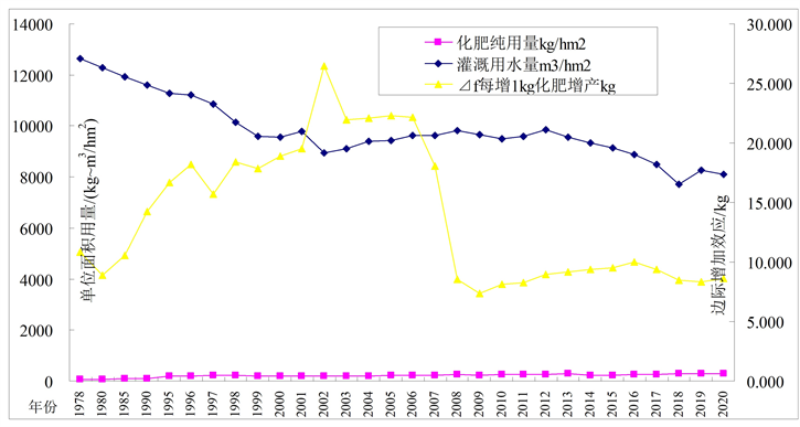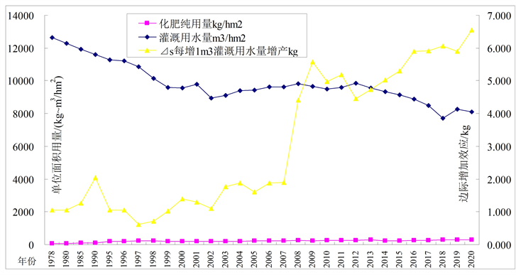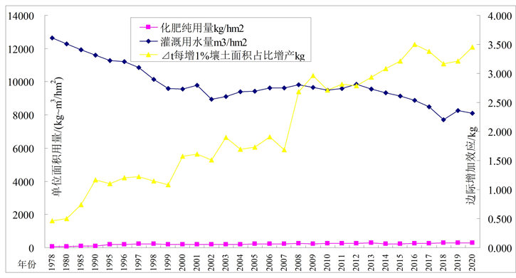 基于农田1978至2020年长系列信息,获得化肥纯用量、灌溉用水量与边际效应关联分析结果如图2所示。可以看出,化肥纯用量由1978年的58 kg/hm2增至2020年的303 kg/hm2,年均215 kg/hm2;灌溉用水量由1978年的12,649 m3/hm2减至2020年的8117 m3/hm2,年均9830 m3/hm2。在此肥水投入状态下,壤土面积占比⊿t边际效应呈平稳上升走势;化肥纯用量⊿f边际效应1978至2002年先增后快速下跌,2008至2020年呈现较平稳略升走势;灌溉用水量⊿s边际效应1978至2007年呈现小幅增加后至2020年表现为快速上升走势。分析表明,农田化肥施用强度偏大,出现了化肥投入产出报酬递减效应,科学合理减少化肥投入已显出来。农田灌溉用水量1978至1998年间高达12,649~10,132 m3/hm2,进入2000年后随着新疆农业节水尤其是滴灌高效节水技术推广应用,灌溉用水量逐年稳中有降至2020年的8241 m3/hm2,比1978年12,649 m3/hm2节省34.8%。由此看出,随着农业节水技术发展,农田灌溉用水量逐步减少节省了水量,呈现出灌溉水资源利用效率及作物产量提升态势,体现了土肥水主导因素投入产出边际报酬递增响应。