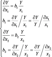 该模型对投入产出之间依存关系数学描述,具有的特点体现在:① 由式(1)分别对x1和x2求Y偏导,可得边际影响效应:
