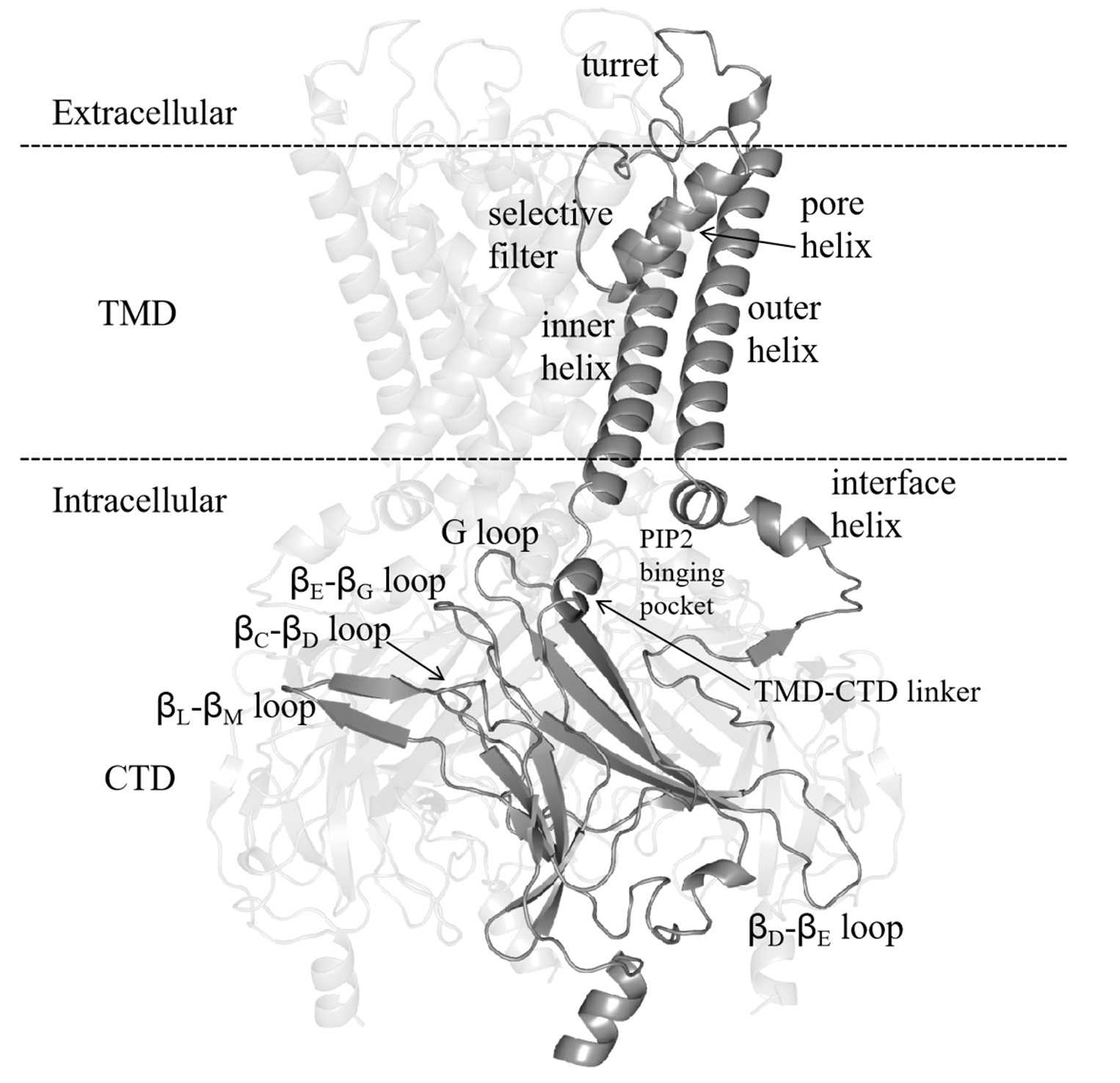 图1. Kir3.2通道蛋白结构的卡通图,标注了Kir3.2的重要功能区