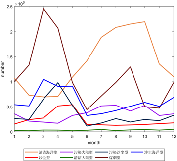 如图4所示,总结了台湾海峡海域十年来每月的各类型气溶胶的出现次数,并做出相应变化曲线。