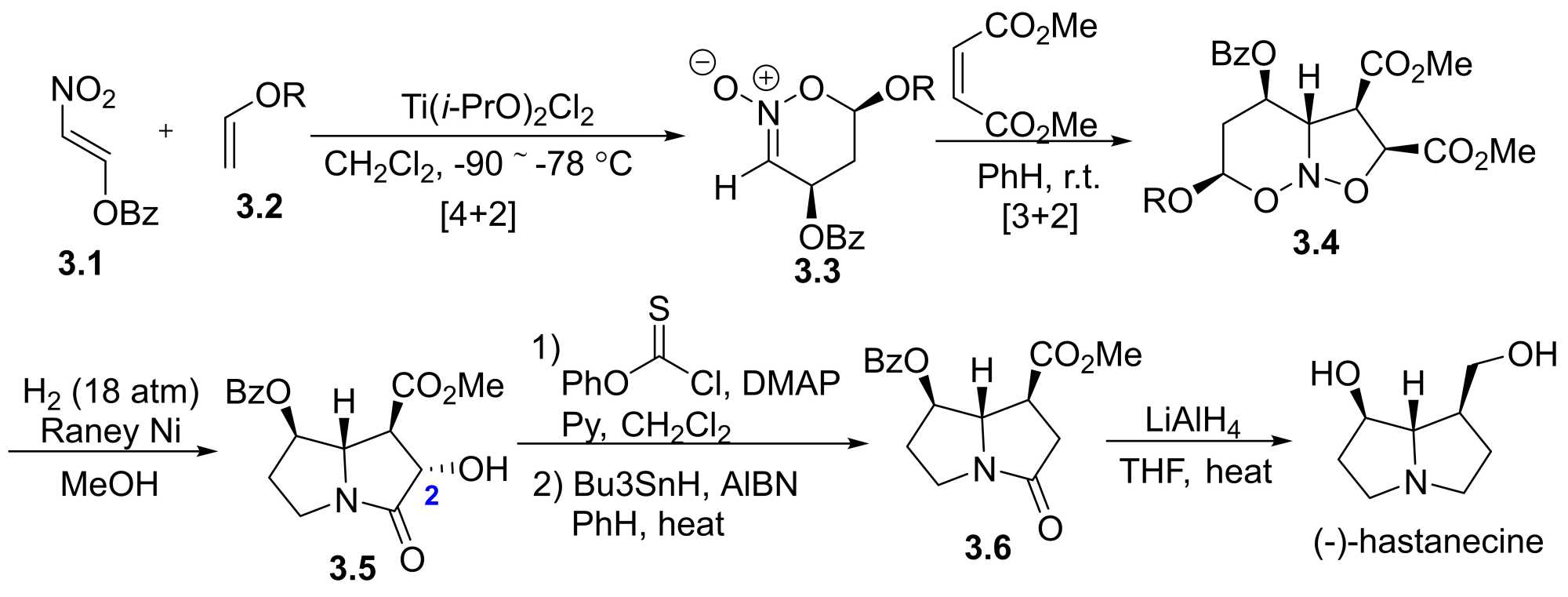 1994年,Scott E. Denmark及其团队[17] [8]开发了一种高效的方法,利用连续的[4 + 2]和[3 + 2]环加成反应合成一系列1,7-顺式二取代吡咯里西啶生物碱(图8)。最初,他们将这一策略应用于(−)-hastanecine的全合成。该方法通过利用Lewis酸催化,将硝基烯烃3.1和含手性导向基团的乙烯基醚3.1进行[4 + 2]环加成反应,生成硝酸酯3.3,随后与马来酸二甲酯进行[3 + 2]环加成反应,形成化合物3.4。亚硝基缩醛3.4作为单一的非对映异构体,经过N-O还原裂解和双重缩合得到吡咯利嗪酮3.5。随后,吡咯利嗪酮3.5经去除C-(2)位的羟基得到化合物3.6,最后对3.6的苯甲酰基和酯基进行还原,最终以71%的总收率得到吡咯里西啶生物碱(−)-hastanecine。