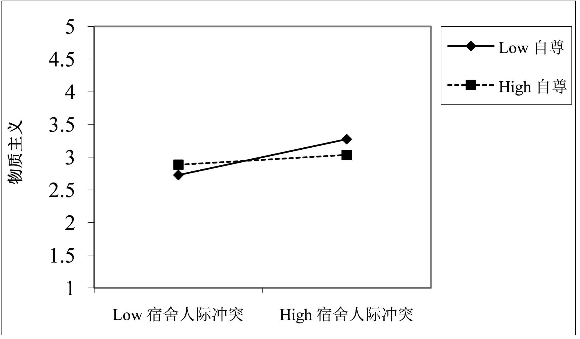 本研究发现自尊高的个体在宿舍人际冲突中不容易产生物质主义倾向,相反,低自尊个体在面对宿舍人际冲突时,更容易产生物质主义倾向。此结果与以往相关研究一致。例如有研究认为低自尊与物质主义互为因果(周静,谢天,2019)。在宿舍人际冲突时,低自尊者倾向于回避冲突而不是积极解决,他们往往自我认同感低,缺乏安全感(何琼等,2018),而物质的强大力量使得低自尊者获得心理上的安全感,因而加剧了他们的物质主义倾向。高自尊个体则不需要物质力量来弥补心理上的不安全感。