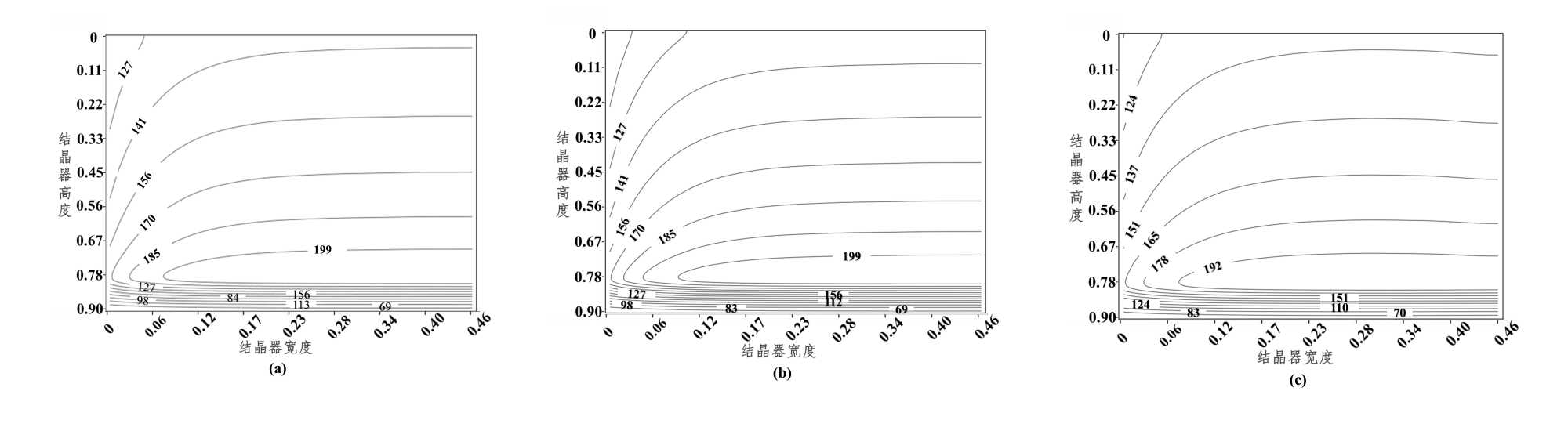 图3(b)、图3(c)为倒角半径由20 mm改为34 mm结晶器温度图。增大倒角半径,宽面中心温度略微降低,均温相较趋于一条水平直线。对比图中弯月面区域铜板最高温度下降7℃~10℃,纵向温度变化率沿y轴降低,差值减小,温度分布均匀性显著提高。弧形水槽下的宽、窄面结晶器铜板温度,温度波动较小,差值均在5℃~8℃左右,整体温度梯度较低,冷却效果最佳。