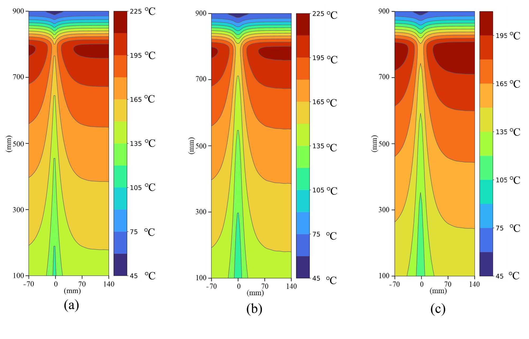 水槽和倒角结构作为保证连铸坯高质、高效的关键,其优化调整会对铜板传热均匀性产生直接影响[12] [13] [14]。本文将模拟三种结晶器工作稳定后的温度分布情况进行对比分析。图1为铜板宽面和窄面的温度分布图。其中图3(a)、图3(d)为小倒角矩形水槽构型,图3(b)、图3(e)为小倒角弧形水槽构型,图3(c)、图3(f)为大倒角弧形水槽构型。