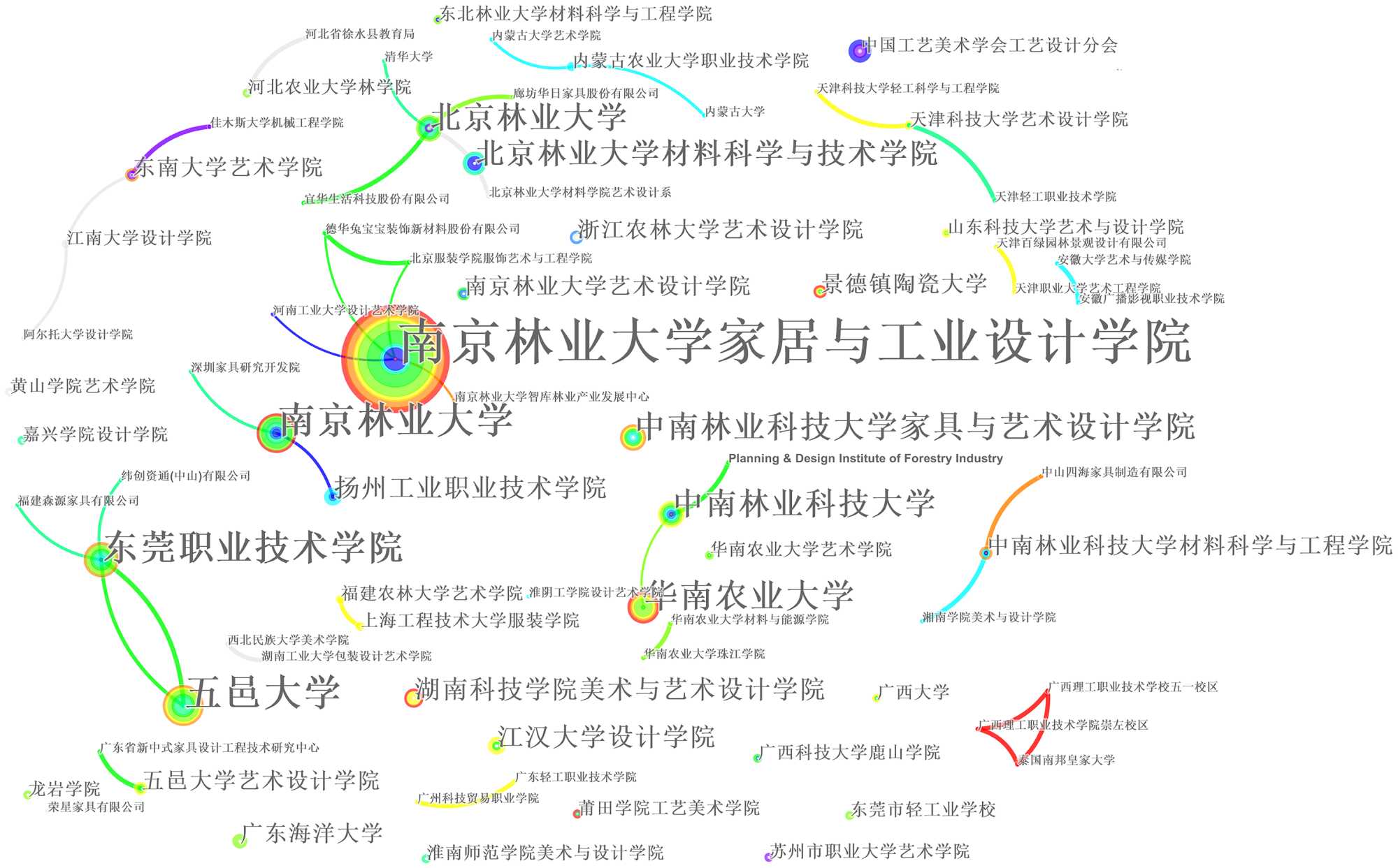 新中式家具设计的核心研究机构,其研究成果通常具有一定权威性,并且代表了该领域的热点话题,因此也是学者的重点关注对象[2]。如图1所示,2013年至2023年新中式家具设计研究机构的合作网络节点数207,合作关系数39,网络密度仅为0.0018,根据网络密度可知各机构之间合作程度不高。图谱中彩虹色节点的大小直接反映该机构的发文量,节点间的连线表示机构间的合作关系,且机构之间的合作产出越高则连线越粗[3]。在新中式家具设计领域产出研究论文排名前10的机构包括南京林业大学家居与工业设计学院(23篇)、南京林业大学(9篇)、五邑大学(9篇)、东莞职业技术学院(8篇)、华南农业大学(7篇)、中南林业科技大学家具与艺术设计学院(6篇)、中南林业科技大学(6篇)、北京林业大学(6篇)、中国工艺美术学会工艺设计分会(5篇)、北京林业大学材料科学与技术学院(5篇),可知在新中式家具设计研究领域较为活跃的机构以农林类高校为主,又以南京林业大学、中南林业科技大学、北京林业大学和华南农业大学四所高校最为突出。