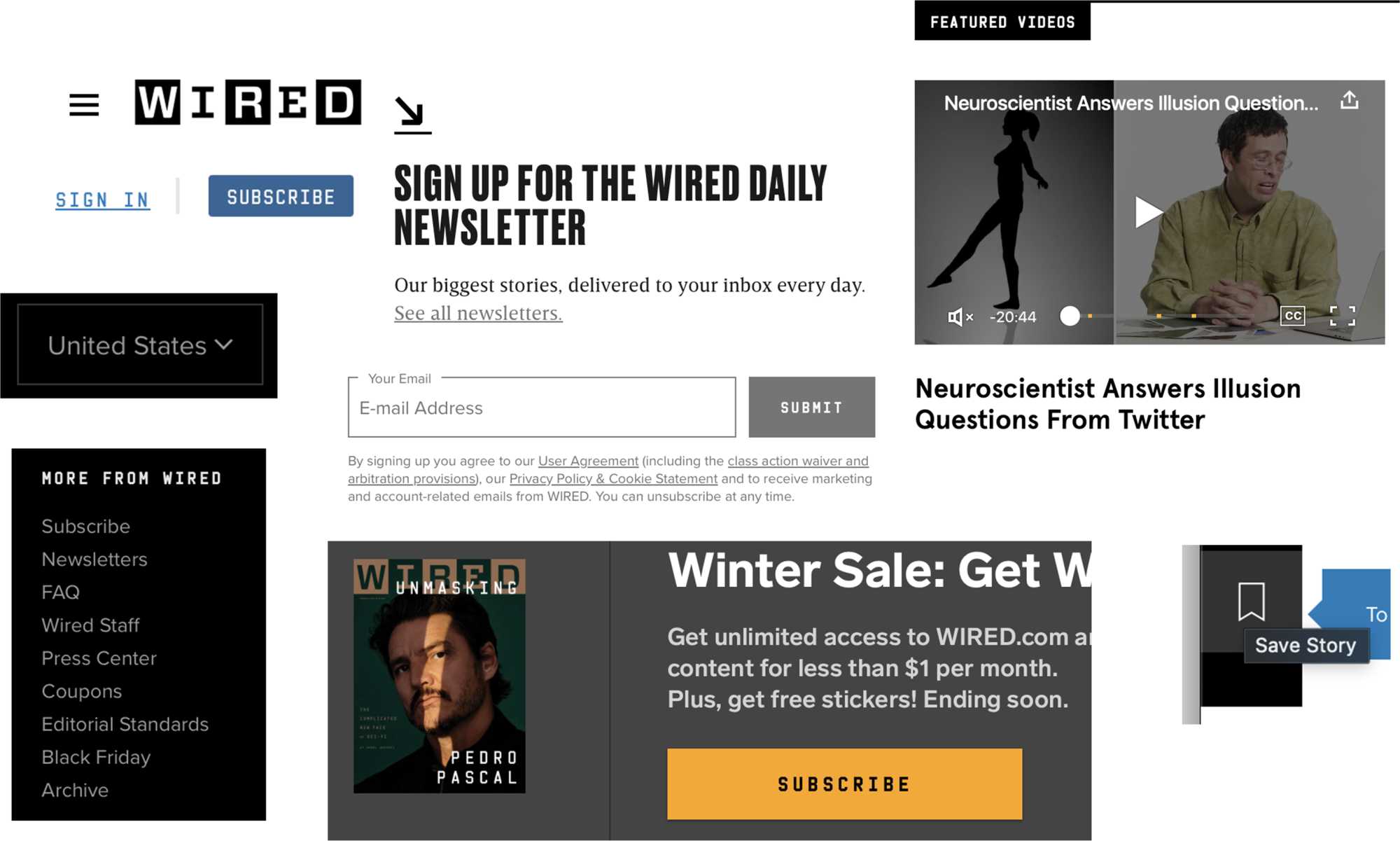 目前而言,电子杂志的整体界面交互风格主要趋向于凛冽干脆,着重对具体的功能性要素的展示。美国《连线》杂志电子刊的登陆、订阅、评论、收藏、播放、Newsletter等交互元素,都采用了业内较为统一的设计语言(见图1),在降低认知负荷的同时,也提供了功能主义意涵上的“器官”,共同构成电子杂志的身体。而也正是这样的交互装置,将用户的感知切割成“零部件”,再依循杂志本身的风格旨归重新组装,创造出连续、不自觉的交互体验。换言之,读者断裂的“自我”在电子杂志的交互装置中囤积,形成了连续的“自我”投射,也正是这样的再解构过程,成就了电子杂志相较于平面印刷物的独特呼吸感,进而更令读者热衷阅读。
