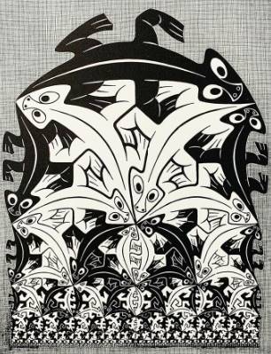 不对称平衡则通过元素的大小、形状、颜色、明暗等组合创造整体平衡。它不依赖严格的镜像对称,呈现出一种动态和活力。荷兰艺术家M.C. Escher的作品(图5)常采用不对称平衡,通过复杂而独特的图案和形式组合,创造视觉上的平衡和变化。