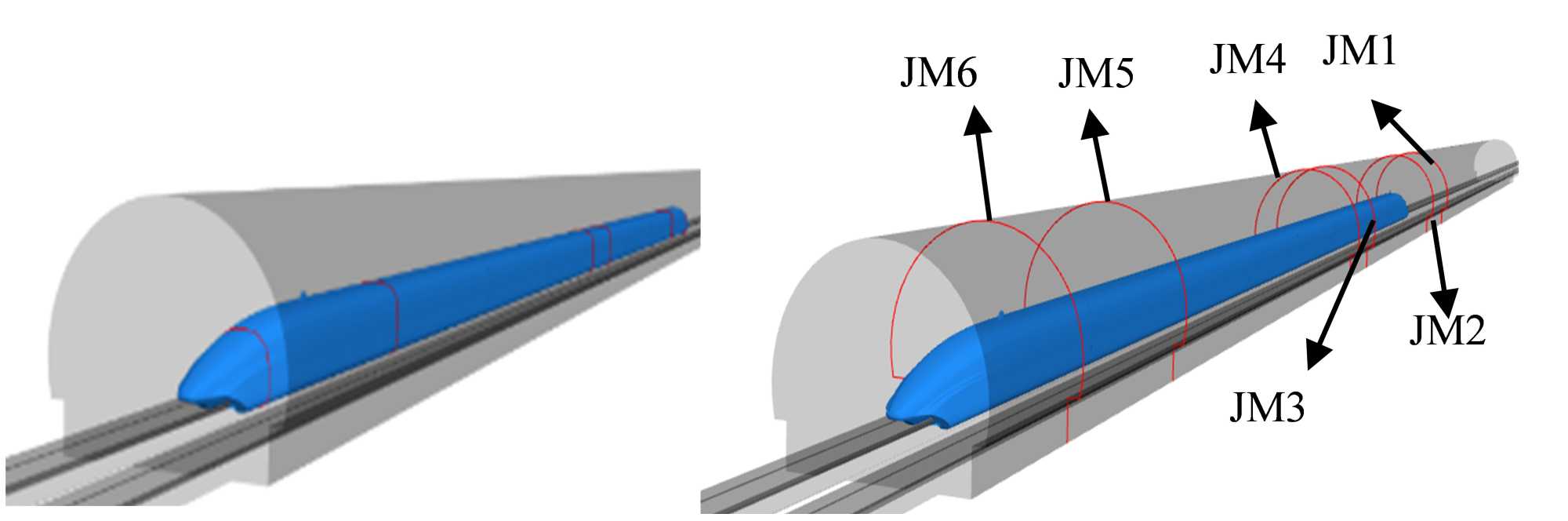 日本学者Takanobu Ogawa等人[1]就针对磁浮列车在隧道内运行时产生的可压缩流动问题,采用数值模拟方法进行研究,明确了单列车进入隧道过程中压力波的形成和两列车在隧道中交会时的流场结构。飯田雅宣等人[2]采用数值模拟方法对高速列车驶入隧道过程中产生压力脉冲波的特性进行研究。山崎幹男等人[3]为实现山梨试验线隧道衬砌结构的合理的耐风压设计的目的,以三维可压缩流体为对象进行了时速超过500公里磁浮的列车驶入和驶出隧道的数值流体解析,通过与实测结果的比较验证,确保了结果的准确性。本田敦等人[4]同样以山梨试验线为背景,对时速500公里磁浮列车通过隧道产生的压缩波进行测量。同年高橋和也等人[5]不同型式入口缓冲结构对隧道出口微气压波的降低效果。宫本雅章[6]在时速500公里的磁浮线路上测量列车行驶的压力变化以及列车周围的流动结构,进而明确了磁浮列车通过时隧道表面衬砌的最大正负压值。其它国家针对磁浮列车也展开了一系列相关研究,Tyll等[7]利用其搭建的高速运动轨道试验系统,研究了TR06型磁浮列车的流场分布情况和气动力特性,采用移动轨道方法研究了地面效应对磁浮列车气动力的影响。Siclari等[8]对TR06型磁浮列车周围流场进行了数值模拟分析,其尾部流场结果与Tyll试验结果吻合度很高。Klopfer等[9]使用RANS CFD方法,模拟了EDS型磁浮列车在U型槽轨道内运行时周围流场分布情况。Th. Tielkes等[10]综述了磁浮列车通过不同长度隧道时,隧道横截面积和列车速度对车身最大压力的影响。