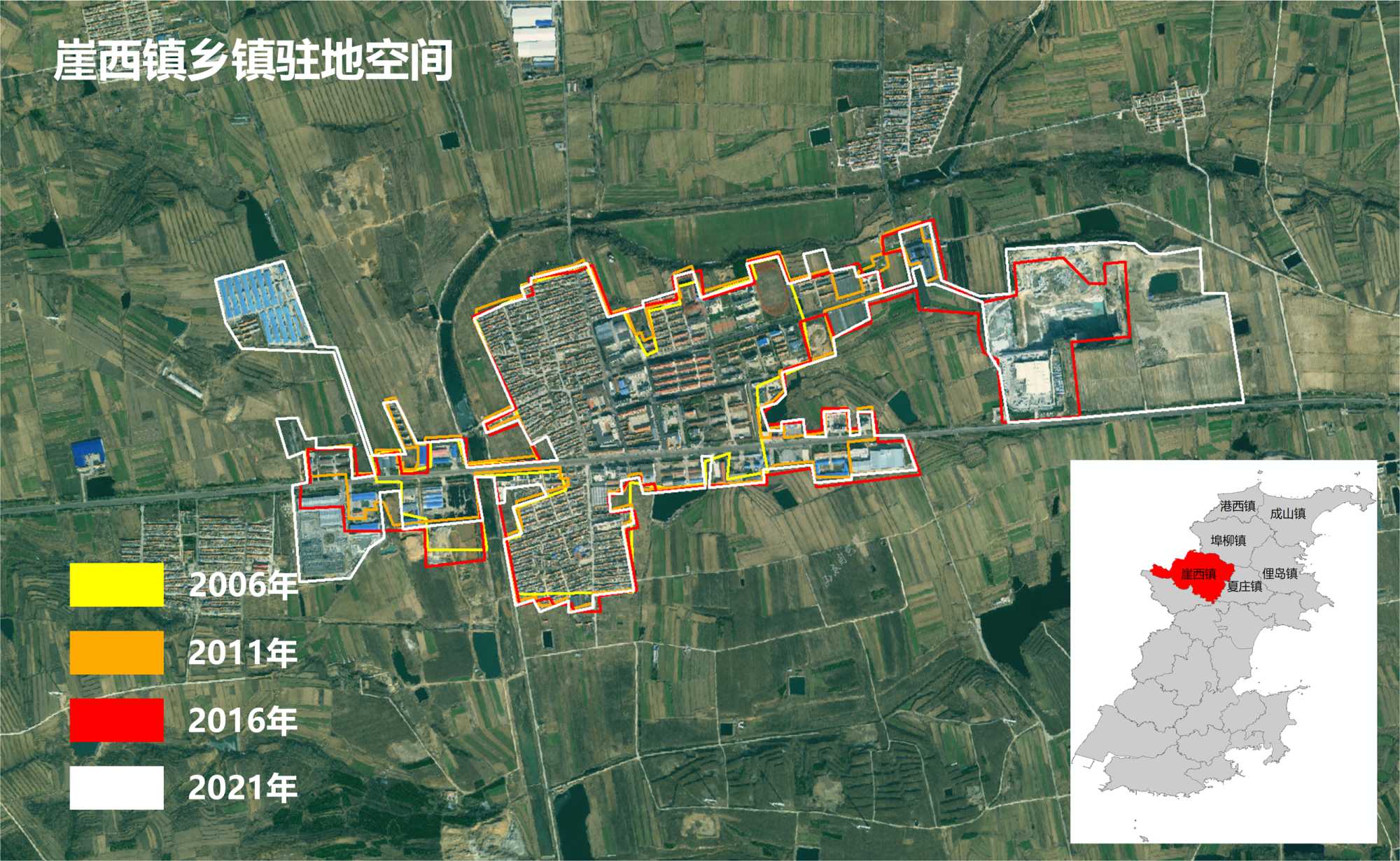 (2) 港西镇:2006年为带形轮廓,之后的发展扔保留了带形发展的骨架,2011~2016年发展平缓,主要向北侧和南侧部分延展,2021年后主要拓展区域为镇驻地北侧的社区拓展。