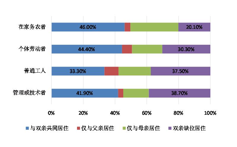 为了揭示父母职业类型与家庭居住安排之间的关系,课题组统计了儿童父母职业类型不同情况下,家庭居住安排的分布差异。结果表明,在家务农家庭中,子女与父母分离的可能性越小,而子女与父母共同居住的可能性越高(与父母共同居住的比重达到46%,而双亲缺位居住的比重仅为20%)。除此之外,若父母的职业是非农职业,则外出务工、工作生活的可能性更高,更有可能将子女留在家中,造成亲子分离。尤其是,父母若为普通工人岗位,可能更无暇顾及子女,这一职业类别下仅有33%的儿童与父母共同居住。双亲缺位居住的比重最高的是父母职业为管理或技术岗位、普通工人,比重接近四成(见图5)。