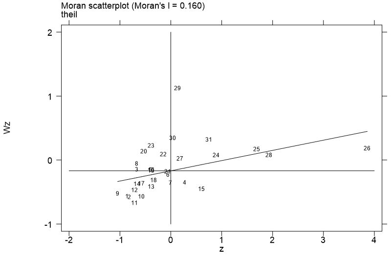 全局莫兰指数(Global Moran’s I)是一种用来衡量空间自相关性的统计指标,它可以帮助我们了解地理空间上的特征值是否呈现出聚集或者分散的趋势。其计算公式为: