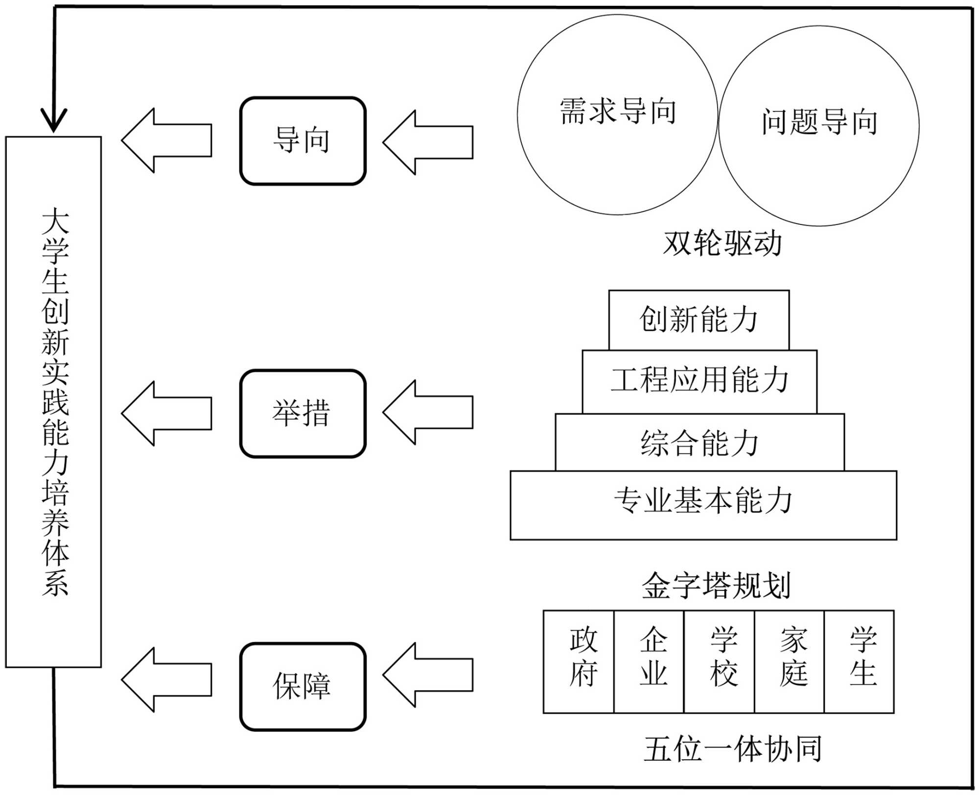 在图1所示的大学生创新实践能力培养机制中,以本科生创新实践能力提升为目标,基于导师签订的实际科研课题,确定了需求和问题的“双轮驱动”作为导向、以层次递进的“金字塔规划”能力训练作为举措,结合多方面“五位一体协同助推”作为保障,让参与的本科生对创新训练项目“高看一眼,厚爱一分,下真功,求实效”,有力推动大学生在参与创新创业项目中获得实际收获。