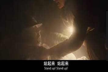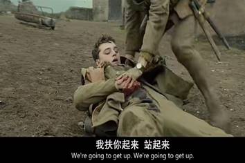在这部电影中,“活着是起立”这一多模态隐喻出现过很多次。Blake和Schofield在执行任务途中进入了一个德国军队挖的洞穴。德国士兵已经撤退,但是在撤退前在洞穴里埋下了炸弹。突然,一只老鼠跑了出来,触发了机关,引发了爆炸,导致洞穴坍塌,两人都被洞穴上层的土掩埋。随后Blake苏醒过来,四处寻找Schofield。找到后一边拉着Schofield起来,一边对他说:“Stand up! Stand up!”(见图6)。Blake之所以想让Schofield马上站起来,是因为只有他站起来了,他才有机会逃跑并脱离危险。之后,两人在前往前线的途中,一架德国侦察机被击落,Blake和Schofield从中救出一名德国士兵。Schofield去打水给德国士兵喝时,Blake被德国士兵慌乱中刺中了腹部。Schofield冲到Blake的面前说:“We are going to get up. We are going to get up.”(见图7)。事实上,让受伤的人站起来只会导致失血过多。然而,Schofield仍然希望Blake站起来,因为他不希望Blake去世。在这两处场景中,“up”一词所代表的语言模态和他们起立的动作所代表的图像模态相结合,构成了“活着是起立”这一多模态隐喻。最终Blake没能站起来,只剩下Schofield一人去完成任务,这也体现了生命的脆弱和战争的残酷。