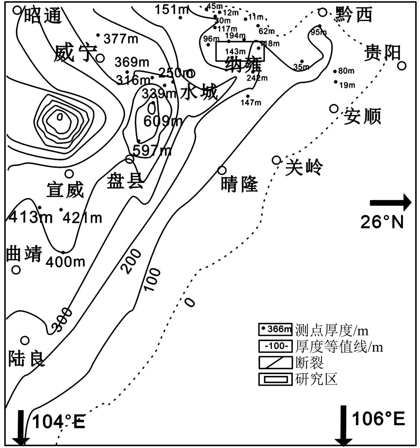 纳雍县位于扬子板块西南缘,峨眉山大火成岩省外带(图1)。主要出露地层为二叠系、三叠系和侏罗系。晚二叠世纳雍地区受东吴运动影响隆起,抬升为陆,峨眉山地幔柱活动,导致大范围玄武岩火山喷发,大面积的峨眉山玄武岩覆盖在中二叠统茅口组灰岩之上,形成峨眉山大火成岩省[6] [7]。玄武岩喷发后,贵州西部很长时间处于古陆状态,二叠纪扬子地块位于古赤道附近的古特提斯洋东部,热带至亚热带雨林气候,化学风化作用强烈,玄武岩遭受强烈风化作用,形成了厚层的玄武岩风化壳[8] [9]。随后由于吴家坪早期的大规模海侵,纳雍地区处于三角洲间湾潮坪沉积体系,形成一套上二叠统龙潭组含煤岩系。
