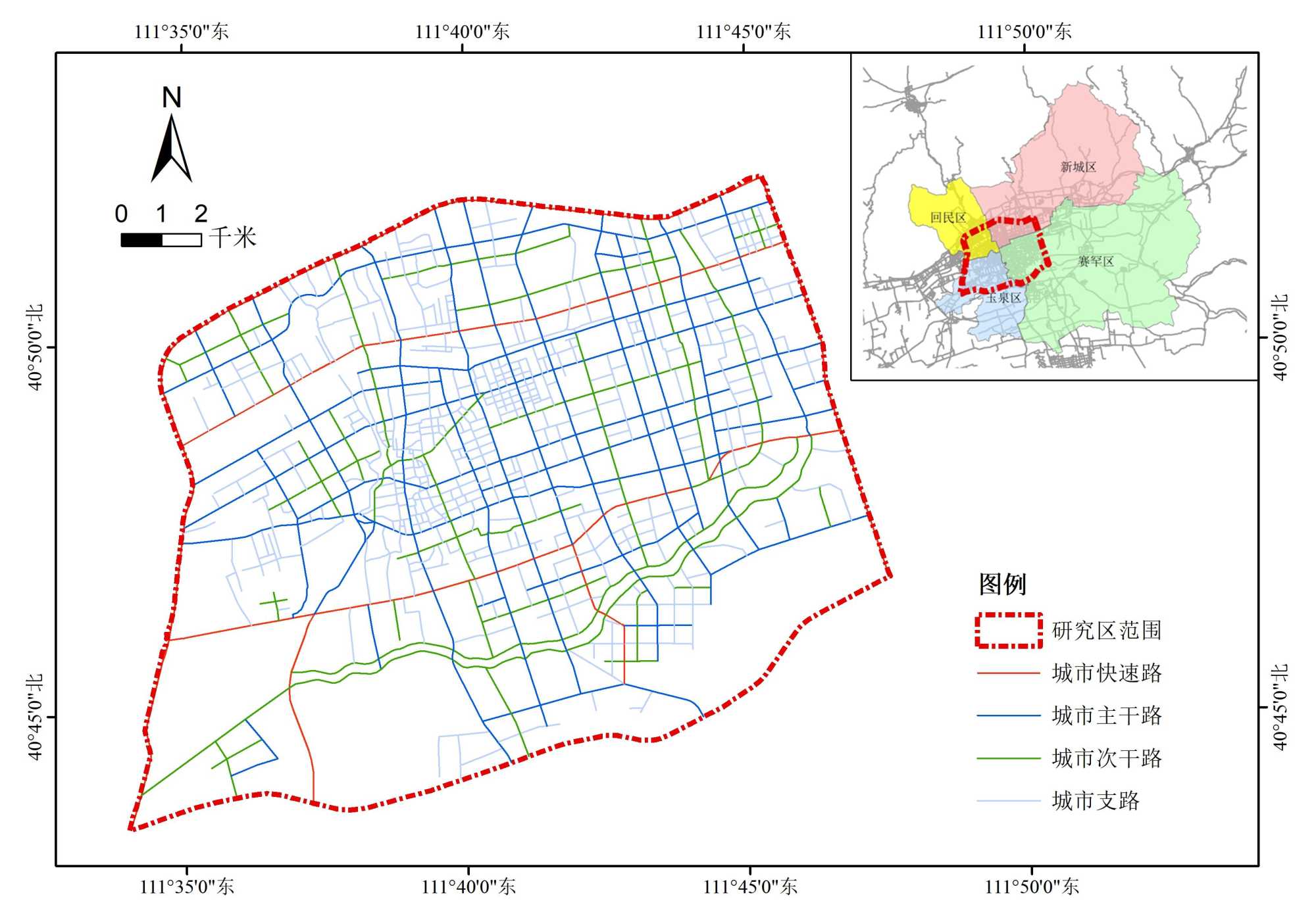 呼和浩特市作为内蒙古自治区的首府,随着近年来城市化进程迅速,其城市绿色空间的建设也备受关注。本研究考虑到街景图像数据的覆盖范围,选取呼和浩特市中心城区为研究区(如图1),该区域由北二环路、西二环路、南三环路及东二环路围合而成,总面积约218.17平方公里。这一区域不仅是呼和浩特市政治、经济、文化的中心,更是市民日常生活的核心区域,承载着丰富的城市绿化功能。为了全面反映中心城区的绿视率情况,本研究选择区域内的城市快速路、主干路、次干路及支路作为研究对象,其中城市快速路的总长度为8.13 km,主干路总长度为22.26 km,次干路总长度为12.64 km,支路总长度为25.28 km。