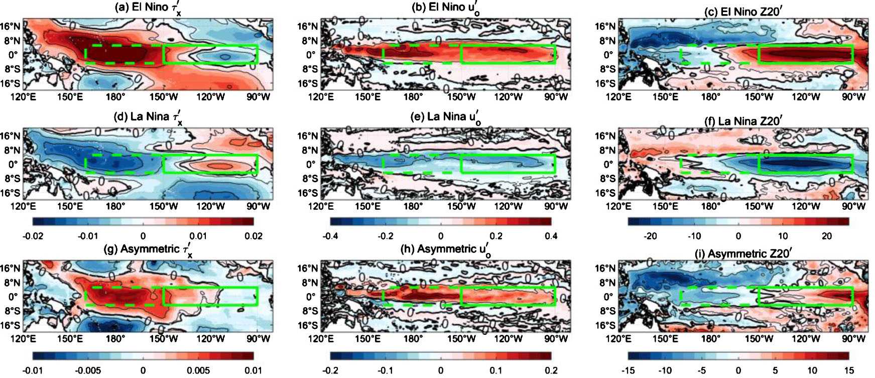 Figure 3. (a) The anomalous wind stress (unit: N/m2), (b) Surface zonal currents (unit: m/s), and (c) Thermocline depth (m) averaged during April and December in the developing year of El Niño. (d)~(f) Similar as (a)~(c), but for those in the developing year of La Niña. (g)~(i) The differences of corresponding variables between El Niño and La Niña. The solid and dashed green boxes denote Niño3 and Niño4 (160˚E~150˚W, 5˚S~5˚N) regions
