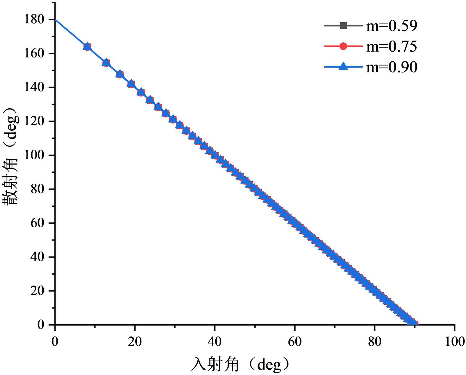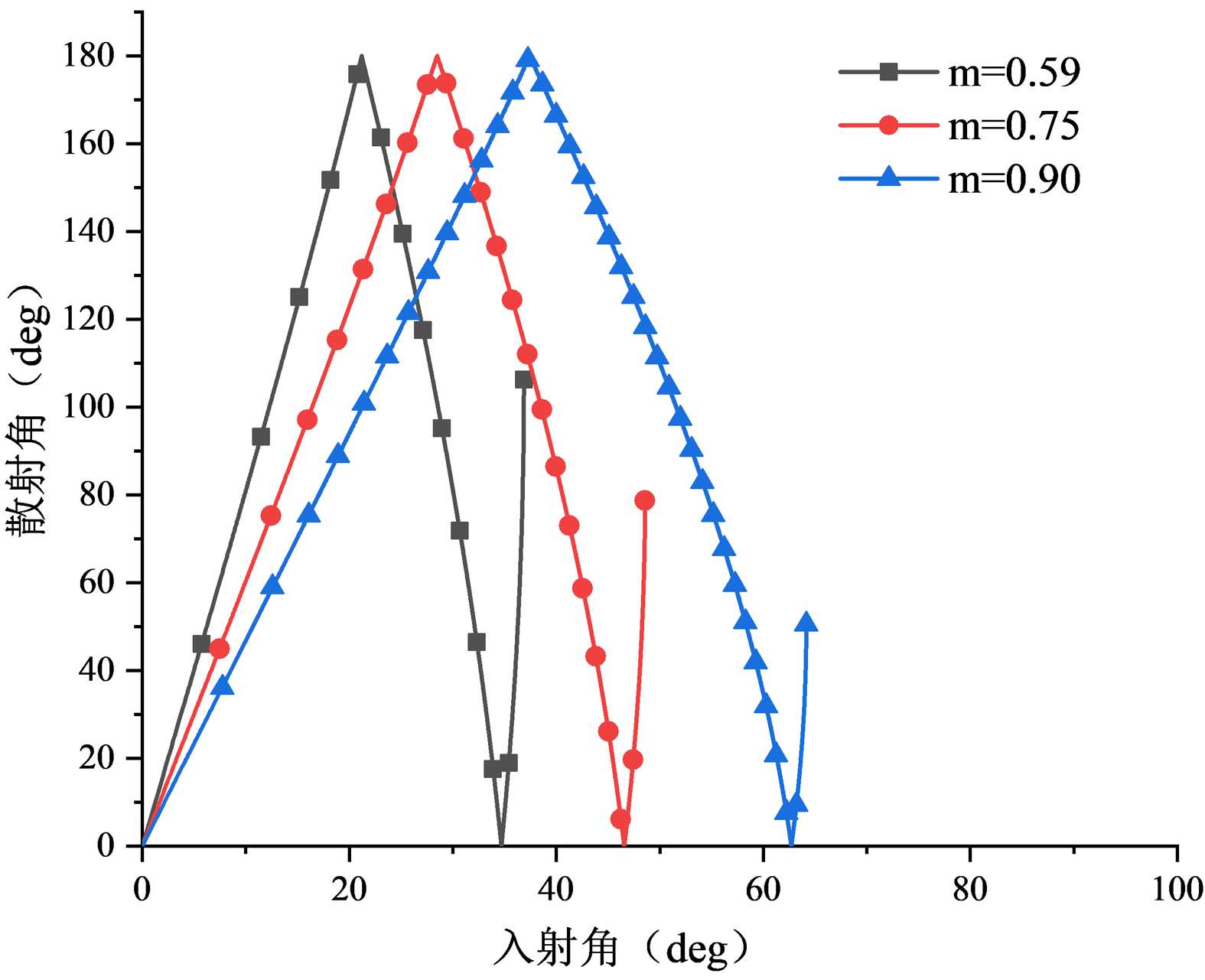 的椭球形气泡,在入射角较小的区域散射角图斜率变化较大,在较大的入射角部分,散射角曲线变化较为缓慢。对于