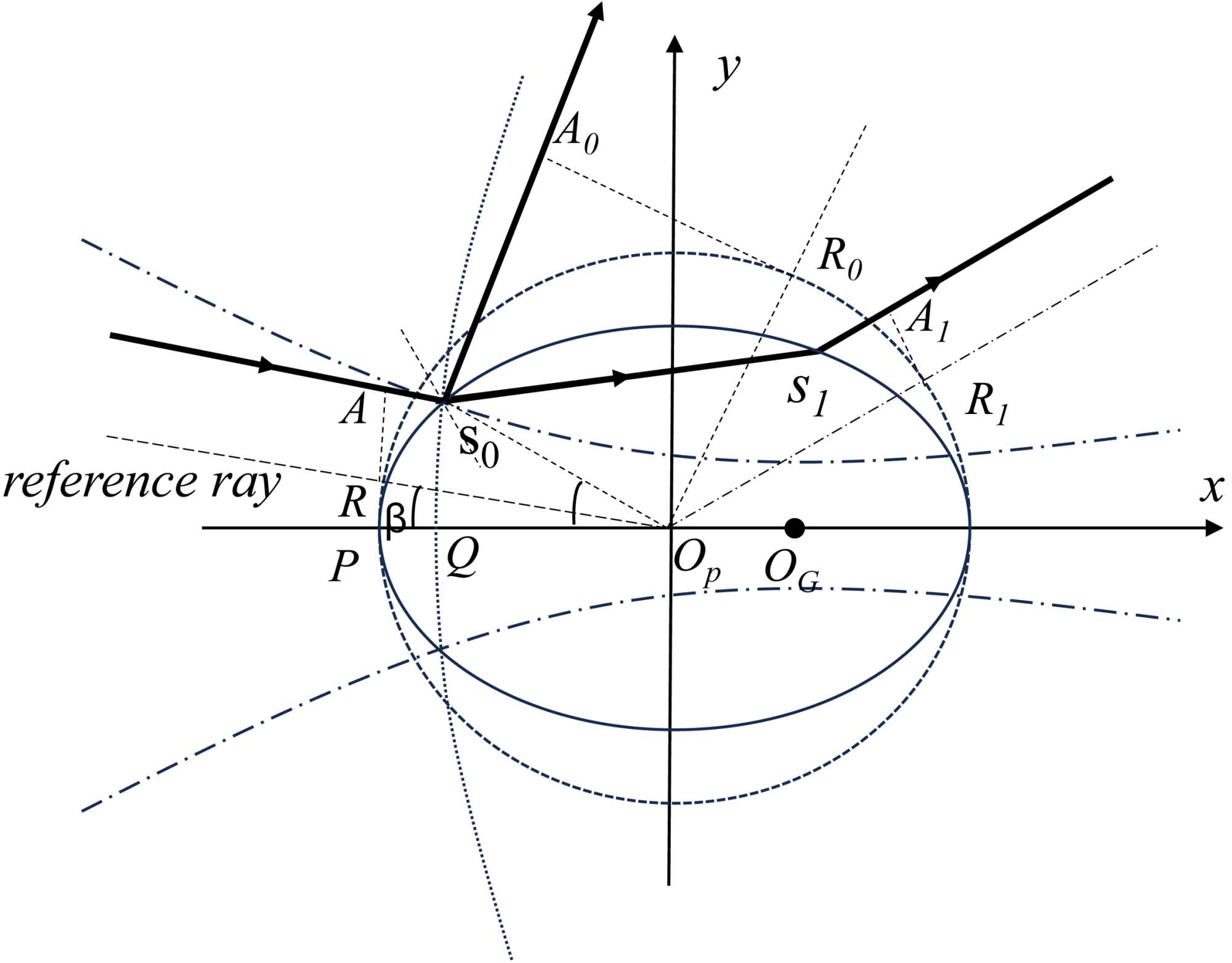 如图2所示,我们以Op为圆心,以半长轴a为半径做参考圆,其中R、R1为半径与参考圆的交点,则反射光线(p = 0)的相移为