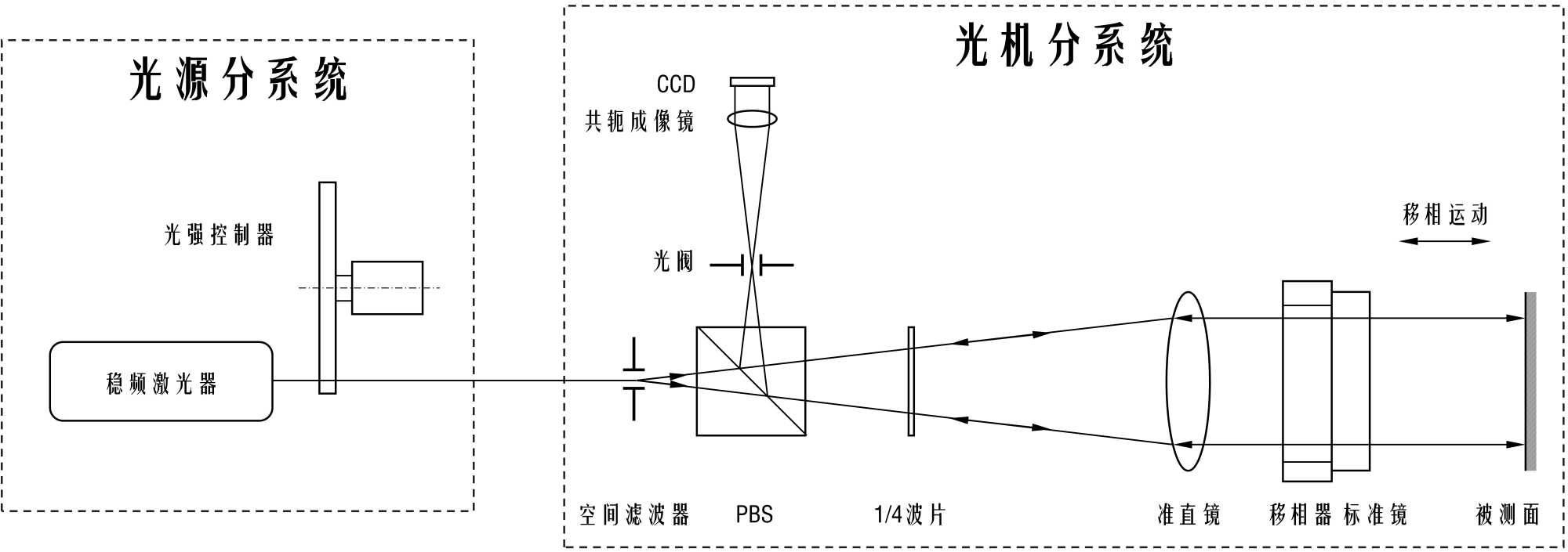 光源分系统包括稳定的窄线宽光源及光强控制器。光机分系统由空间滤波器、分光棱镜(PBS)、1/4波片、准直镜、标准镜、中继镜等光学零件及经过模态分析的抗振动光学支架系统、光学调整架、压电移相器(PZT)等组成。