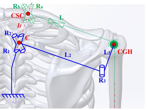 当肱骨做抬升运动时,肩胛骨绕肩锁关节转动同时在胸骨表面滑动,锁骨绕胸锁关节转动,锁骨和肩胛骨的运动都会导致盂肱关节位置变化。三块骨骼的协调运动可以扩大肱骨的运动范围,但也会使CGH在运动过程发生位移,从而导致外骨骼的旋转中心与CGH无法对齐。这是因为忽略了运动过程人体的关节运动旋转中心会发生改变,人机旋转中心无法对齐而产生的动态不相容。而因人机旋转中心无法对齐而产生的动态不相容问题,则需要根据人体肩部的运动规律,设计自对准机构使人–机旋转中心对齐。