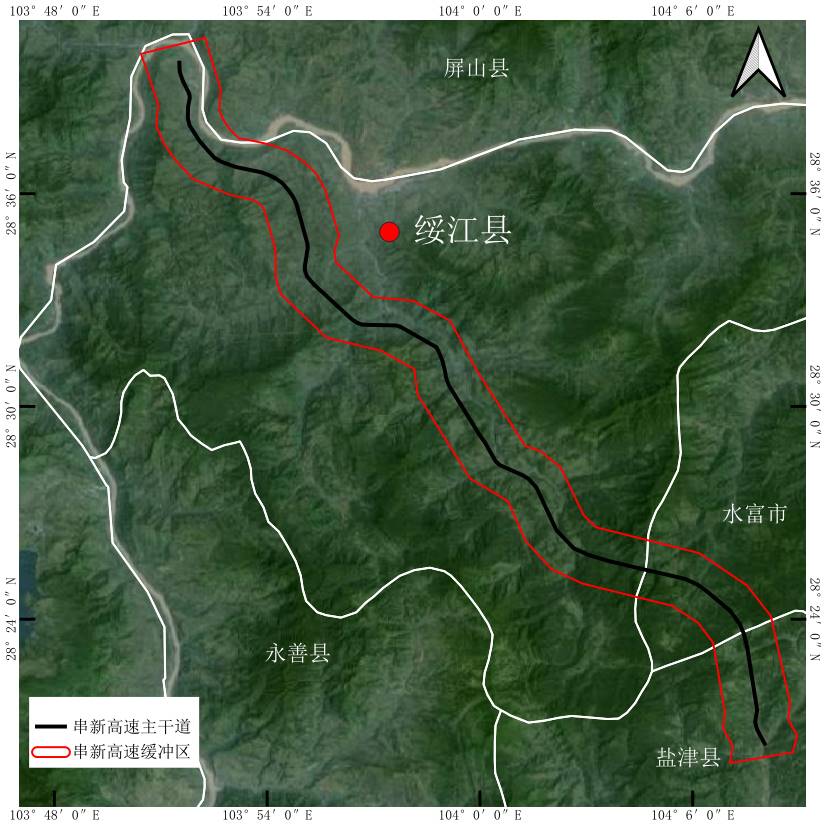 本文选取串新高速并以其沿线为中心设置宽度为3 km的缓冲区作为研究对象,研究区域范围如图1所示。串新高速位于云南省昭通市境内,所在区域属中山山原地貌,地势南高北低,气候具有干雨季分明、雨热同季的特点。串新高速于2017年3月15日正式开工建设,2020年6月30日正式通车运营,起于盐津县普洱镇串丝村,止于绥江县南岸镇,全长49.14公里,桥梁总长度为7660.85米,隧道总长度为33026.7米,桥隧比高达82.73%。