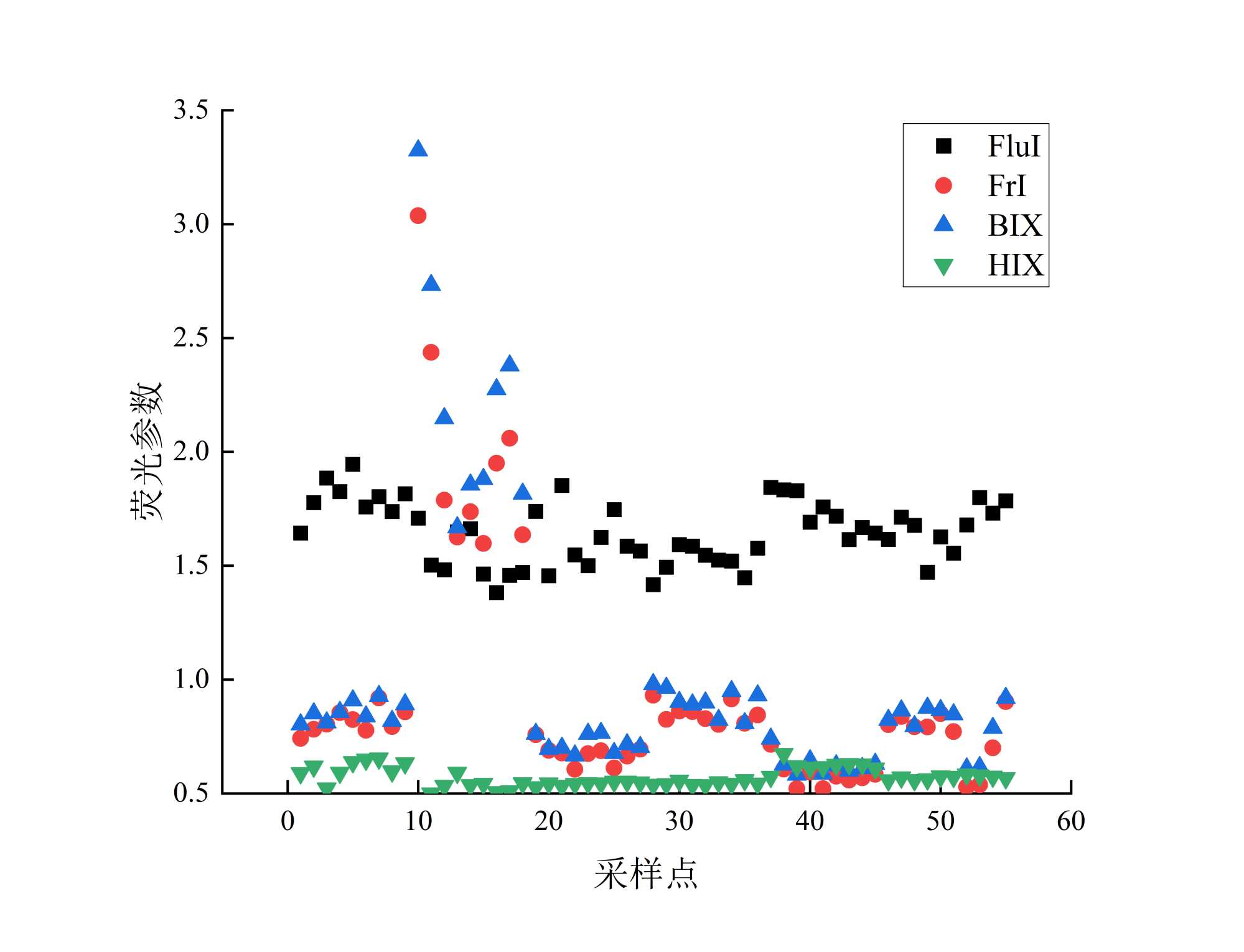 图3. 校园内自然河水水体中DOM的4种荧光参数