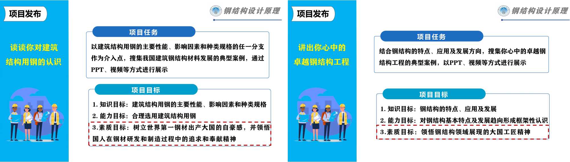 钢结构类课程是一门土木类专业核心课程,也是科学技术理论与工程实践紧密结合的课程。因此,在钢结构科学技术发展过程中蕴含着丰富的思政元素。无论是钢结构材料的研发、钢结构体系的创新还是钢结构工程的建造,都不仅仅是科学技术本身的发展,更多的承载着前辈们爱国奉献、敢于创新的时代精神。正是有了这种大无畏的精神才会创造出新中国成立以来钢结构领域的无数个“第一”,这些都未曾显现在传统印刷模式的专业课程教材中。为此,团队在教学授课环节中,基于目标导向教学理念,构建了课前推送、课中酝酿、课后实施的“项目设计”课程体系,并将课程思政延伸到“项目设计”环节。如图2所示。在这些项目设计中,教师通过项目发布和实施建议,引导学生将爱国情怀、使命担当、精益求精、工匠精神等思政元素自然渗透到项目中。通过项目实施过程的引导,让学生自我体会、发掘精神内涵,进而转化为内在的精神源泉,丰富自身的道德素养。