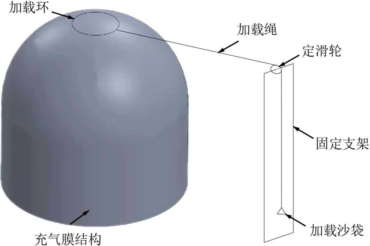 如图2所示,通过加载绳牵引加载环将水平荷载均匀的加在充气膜结构的同一高度处,通过定滑轮将水平加载方式转化为更容易控制的竖向加载方式,然后测量气膜结构顶点的水平位移,得到荷载和水平位移的关系,如图3所示。