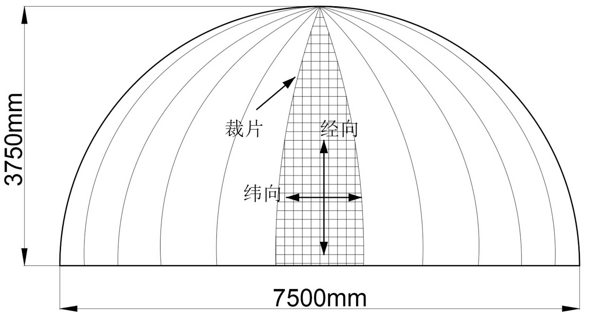 在确定了膜材的材料模型之后,建立半径为3.75 m的半球形有限元模型,作为本文的主要研究对象。如图4所示。