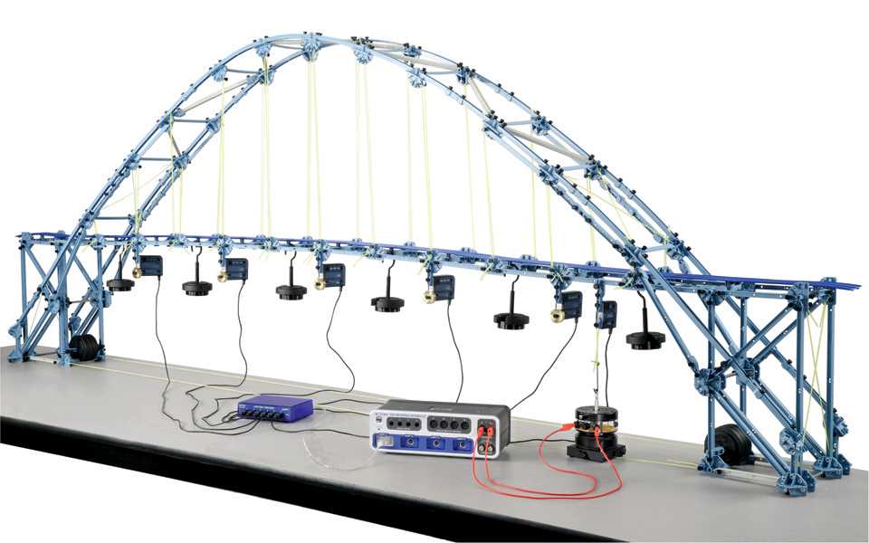 相对于摇摇塔实验,桥梁共振实验(如图2)更加复杂,我们要求学生设计出结构不同的桥梁并研究用手或锤子敲击拱桥所产生的谐振模式。对产生的振动做FFT变换以找到桥梁的共振模式,然后用拟合了每一个谐振频率的正弦力驱动桥梁。在这个过程中,需要学生搭载多个负载单元对振动进行检测,找出桥梁的振荡节点,同时,我们可以在实验过程中对桥梁引入结构缺陷,例如重新移动一根或多根工字型梁,然后重复实验,观察桥梁振动的变化[1]。