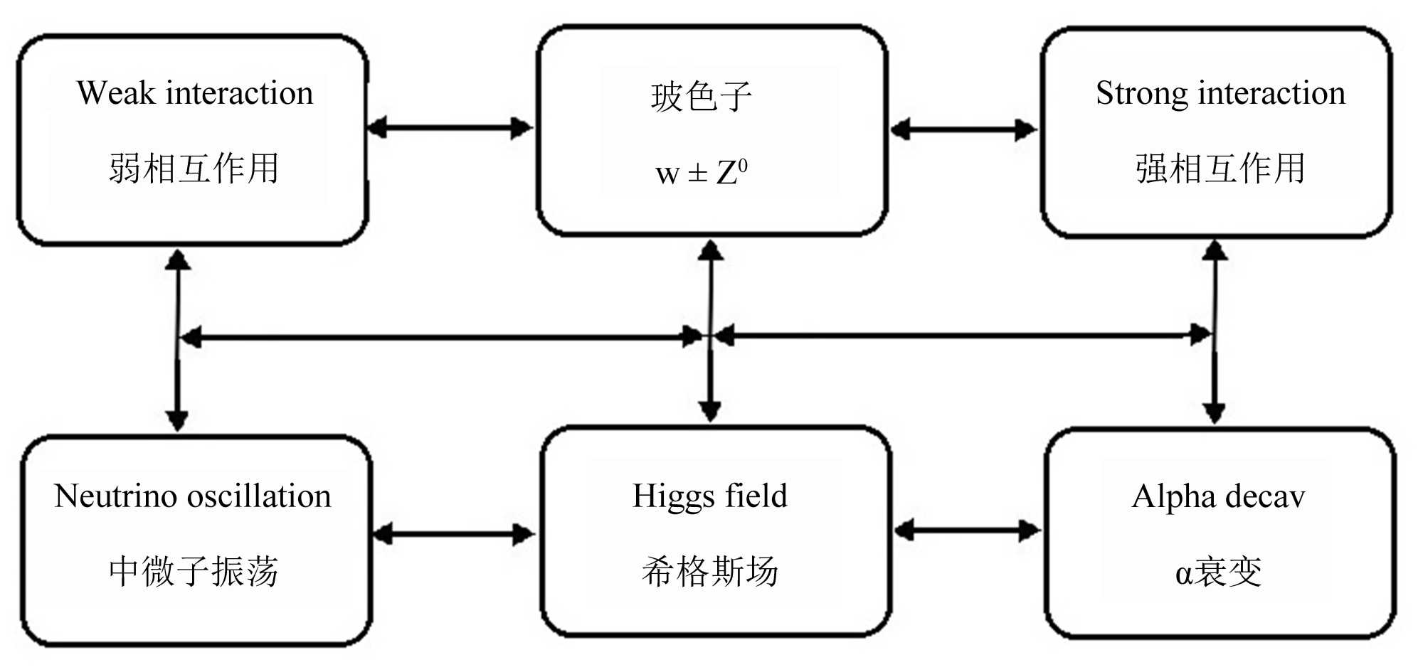 α衰变主要由强相互作用控制,中微子振荡形成的弱有效势,对原子核的α衰变似乎难以产生影响。然而,由于弱相互作用与强相互存在一些耦合和联系(图3),中微子振荡也必将导致强相互作用的波动。这个耦合的桥梁就是希格斯场(Higgs field) [30]-[32]。按照汤川秀树相互作用理论,所有的微观粒子相互作用都是由相应的媒介粒子来传递的。传递弱相互作用的媒介粒子是W±和Z0,它们的质量非常大,分别约为80.4 GeV和91.2 GeV,但是这些粒子并不是原子核内部所固有的,而是在发生弱相互作用时产生的。在此过程中,希格斯粒子与媒介粒子W±和Z0发生耦合,导致规范对称性破坏,使得原本没有质量的W±和Z0玻色子获得质量。由此可见,中微子振荡也包含希格斯场的振荡。希格斯场振荡很可能引诱和放大夸克的某种振荡,从而激发不稳定的丰中子放射性原子核,增大α衰变的几率。
